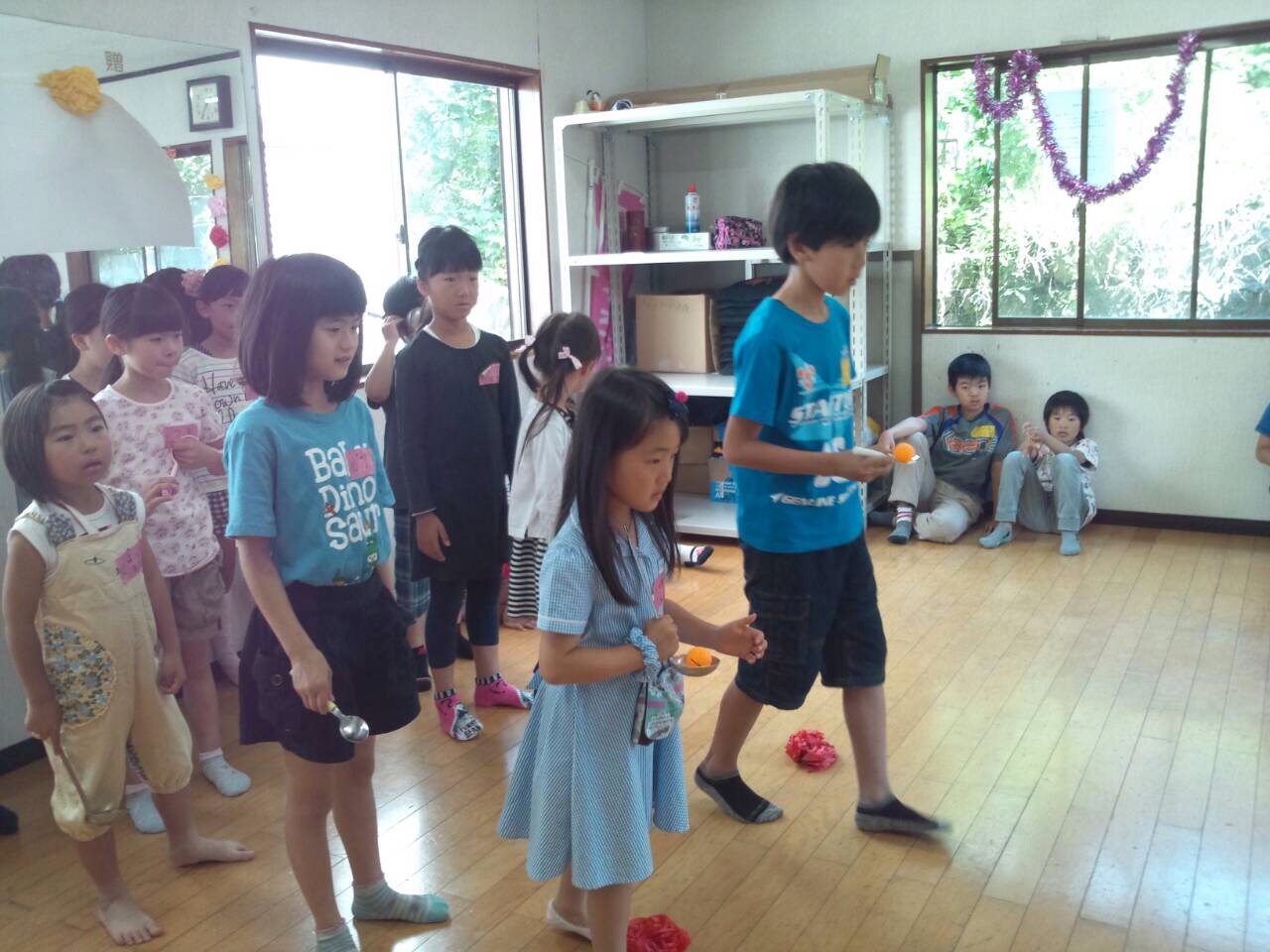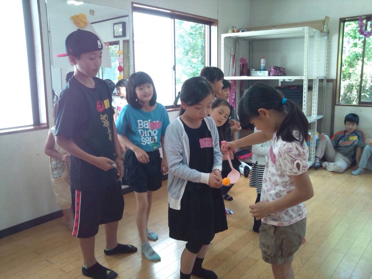 一つ目はボール運びリレー 5チームリーグ戦で行いました。 ピンポン玉を、低学年はお玉、高学年はスプーンで運びます。 決勝戦はかなりのスピードでリレーし盛り上がりました。