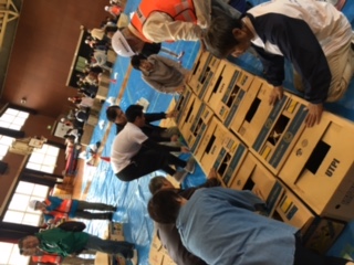 避難所の講堂で寝泊りするのは健康的には大変辛いことです。 段ボールの上に座るだけでも温かさは違います。 今回は段ボールでのベット作りを各町区で体験することができました。