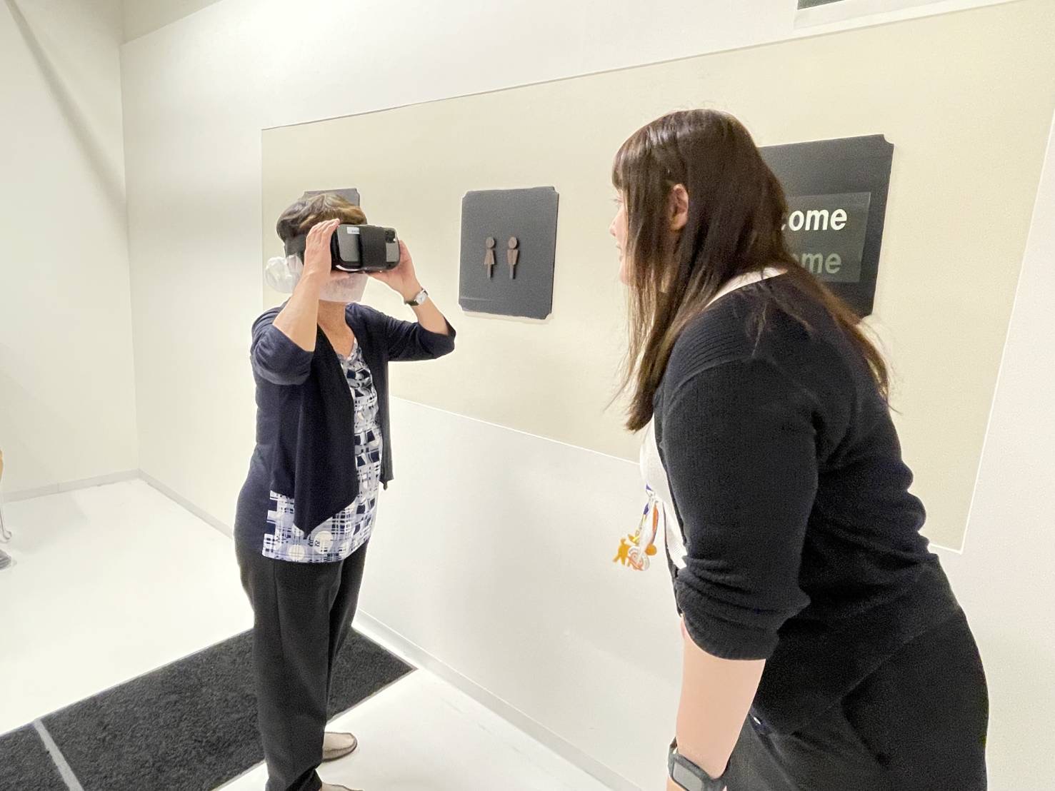 ゴーグルを装着すると、視界が非常に狭くなり、トイレットペーパーの芯から覗いているような感覚でした。 わずかな視野しかなく、目の前にあるものでも全体像を捉えにくいことに驚きました。認知症の方の多くは、加齢とともに視野が狭くなる傾向があるだけでなく、情報が視野に入っても脳が認識しないこともあるそうです。