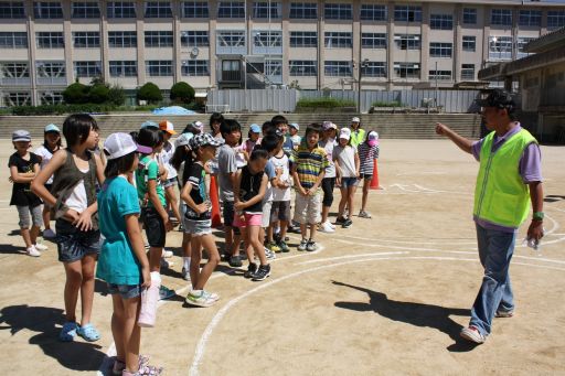 7月19日海の日、長丘公民館の講堂及び長丘小学校の校庭で、小学生交通安全教室が行われました。