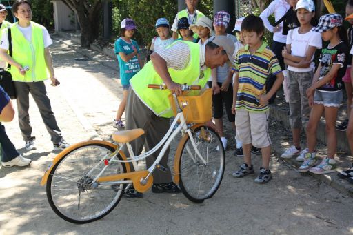 一方、小学校の校庭では、高学年児童30名が参加し自転車教室が行われました。ここでは子ども達は実際に自分の自転車に乗り、安全な自転車の乗り方を学びました。 また、乗る前の点検の仕方や、必ず左側から乗ること、信号や横断歩道での注意点、死角や飛び出し等の危険予知の仕方についての説明には熱心に聞き入っていました。 最後に、全員に文具セットと自転車に付ける反射板が贈られました。