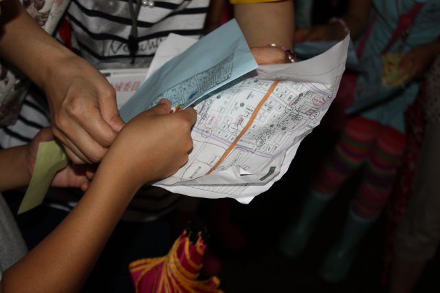 今回、子どもたちは1人1人長丘の地図とシールを持って「子ども110番の家」をまわりました。いま行ったお家のところにシールを貼っていきます。
