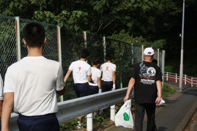 今回のクリーンデーには、長丘中学校の卓球部員が27名も参加してくださいました。なんと頼もしい戦力!!! スタッフの打ち合わせが終わるとすぐに、青育連会長の小宮さんが卓球部のみんなにあいさつし、しきりに「君たちの若い力をお貸しいただいて」と感謝されていました。 作業に入るや、顧問の先生でしょうか、「~君はここ」、「ほら、10メートル間隔で」などテキパキと指示が飛びます。