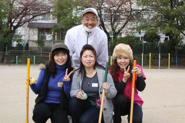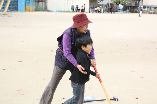 老人会で日頃からグラウンドゴルフをされている方が、子どもたちに、手取り足取り教えながらプレーを楽しんでおられました。 こんな微笑ましい光景が見られるのも、小さな子どもからお年寄りまで楽しめるスポーツならではですね。