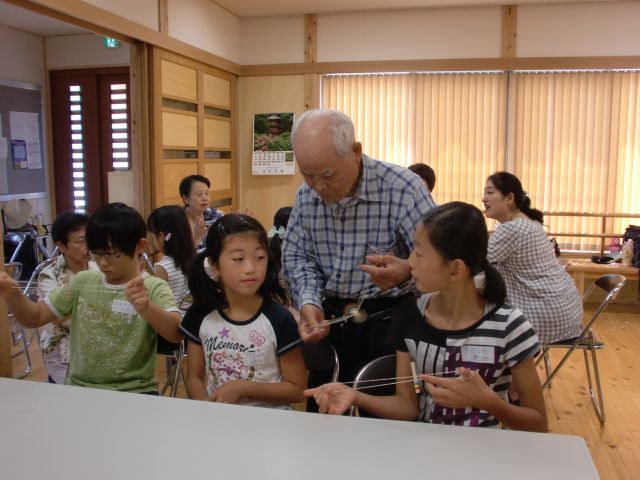 おばあちゃん、おじいちゃんに教えてもらい、最初はなかなか上手にできません。
