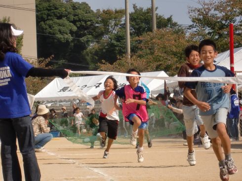 小学校PTA会長の原さん親子の選手宣誓で幕を開けた運動会は、進行役の方々の努力もあり、各競技はほぼ予定した時間通りに進みました。