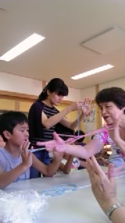 育成会の子どもたちと高齢者11名 で昔あそびのあやとり、 おはじき 、 お手玉 、 ぶんぶんこま を楽しみました。
